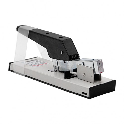 Мощный степлер с максимальной толщиной сшивания бумаги до 100 листов плотностью 80 гр/м2 (до 240 листов плотностью 70 г/кв.м). Пластиковая основа степлера не царапает поверхность стола и предотвращает скольжение. Тип и размер используемых скоб - N 23/6, 23/8, 23/10, 23/13 вместительностью 100 шт. Загрузка скоб в степлер осуществляется горизонтально. Cкобы загружаются оборотной стороны от отверстия, где пробиваются листы.